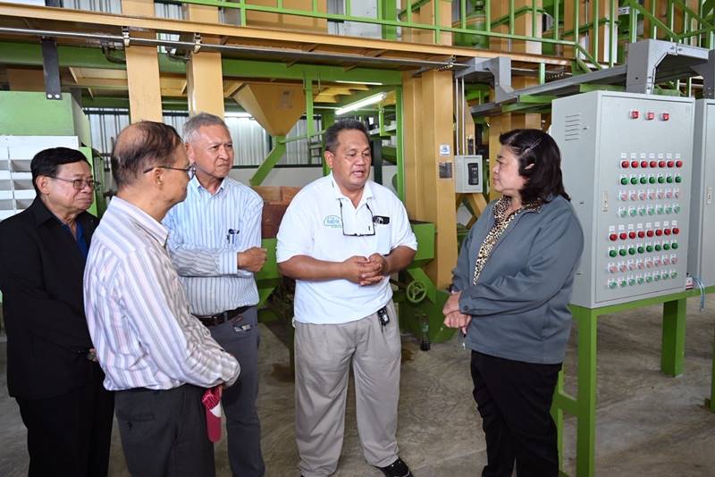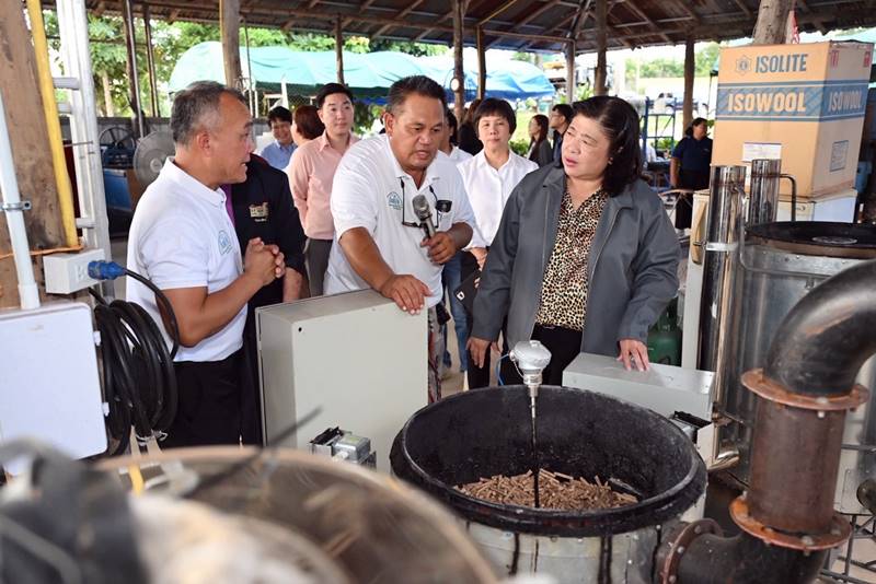 จากนั้นคณะได้เยี่ยมชมและติดตามความก้าวหน้าโครงการลดปัญหาฝุ่นละออง PM2.5 โดยการสร้างรายได้จาก สินค้านวัตกรรมแปรรูปจากชีวมวลข้าวโพด ที่ โรงสีข้าวชุมชนเกษตรอินทรีย์น้ำปั้ว ซึ่งทำงานร่วมกับ วิสาหกิจชุมชนเกษตรอินทรีย์ ตำบลน้ำปั้ว