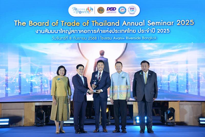 พิธีมอบรางวัลจัดขึ้นในงานสัมมนาใหญ่สภาหอการค้าแห่งประเทศไทย ประจำปี 2025 (The Board of Trade of Thailand Annual Seminar 2025) โดยมี นายวุฒิไกร ลีวีระพันธุ์ (ที่ 2 จากซ้าย) ปลัดกระทรวงพาณิชย์ เป็นผู้มอบรางวัล และ นายพงศ์พสุ อุณาพรหม (กลาง) ตัวแทนอุปนายกฝ่ายรัฐสัมพันธ์ สมาคมการขายตรงไทย เป็นผู้ขึ้นรับรางวัล ณ โรงแรมอวานี พลัส ริเวอร์ไซด์ กรุงเทพ เมื่อวันที่ 8 กันยายนที่ผ่านมา