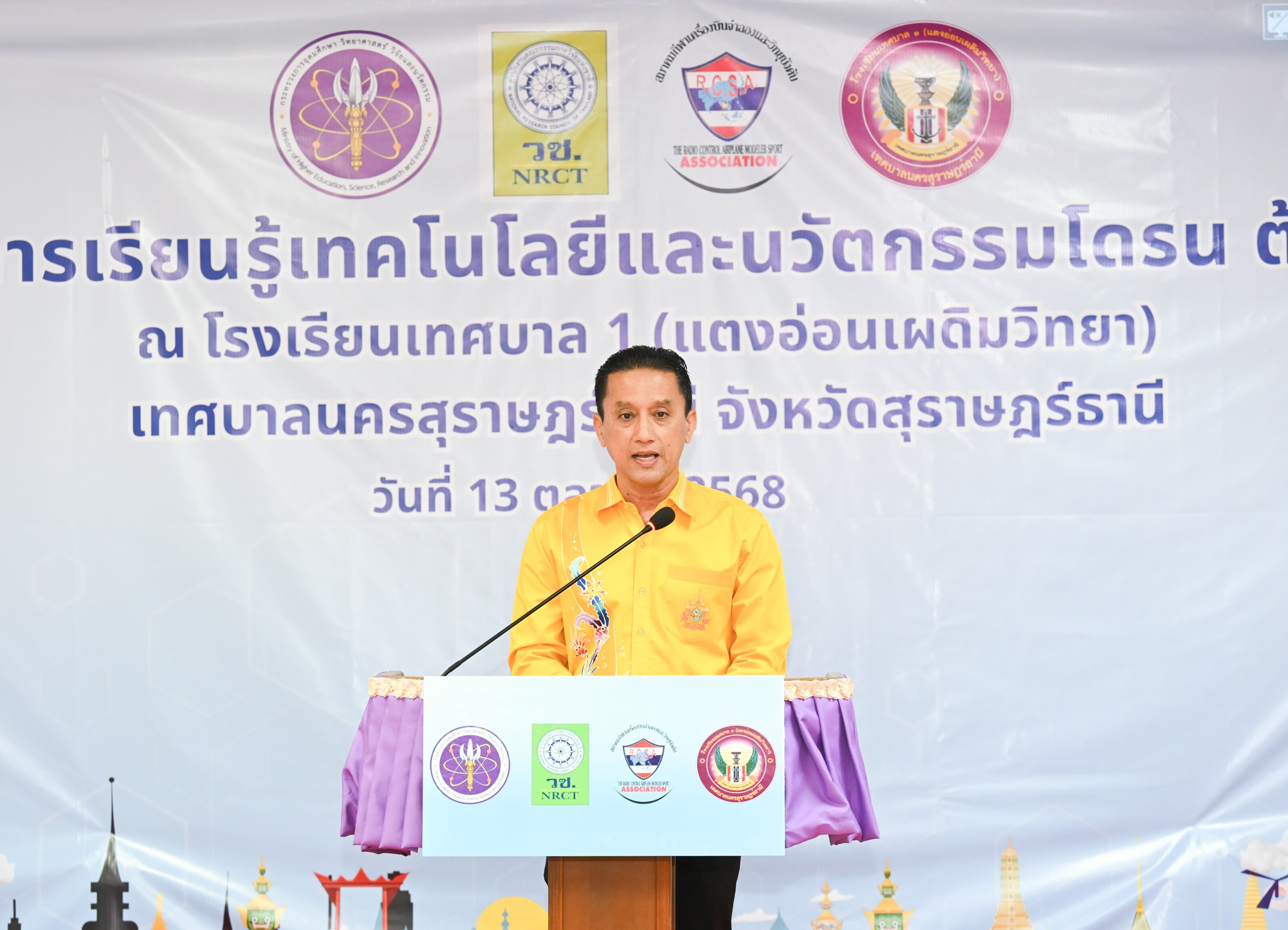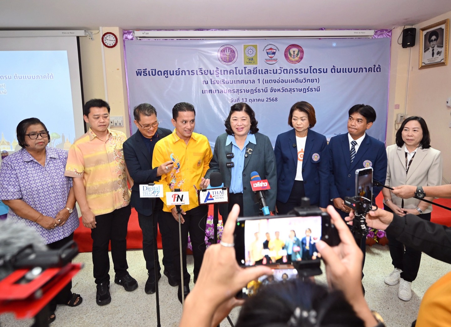 วันที่ 13 ตุลาคม 2568 สำนักงานการวิจัยแห่งชาติ (วช.) กระทรวงการอุดมศึกษา วิทยาศาสตร์ วิจัยและนวัตกรรม โดย ดร.วิภารัตน์ ดีอ่อง ผู้อำนวยการสำนักงานการวิจัยแห่งชาติ เป็นประธานในพิธีเปิด “ศูนย์การเรียนรู้เทคโนโลยีและนวัตกรรมโดรน ต้นแบบภาคใต้” ในการนี้ได้รับเกียรติจาก นายทัศนัย เรืองนุ้ย รองนายกเทศมนตรีนครสุราษฎร์ธานี นายนิวัฒน์ กู้เขียว ผู้อำนวยการโรงเรียนเทศบาล 1 สุราษฎร์ธานี (แตงอ่อนเผดิมวิทยา) คณะผู้ทรงคุณวุฒิจาก วช. และ อาจารย์พิศิษฐ์ มิตรเกื้อกูล นายกสมาคมกีฬาเครื่องบินจำลองและวิทยุบังคับ พร้อมด้วยผู้บริหารสถานศึกษาในพื้นที่ ให้การต้อนรับ ณ โรงเรียนเทศบาล 1 สุราษฎร์ธานี (แตงอ่อนเผดิมวิทยา) จังหวัดสุราษฎร์ธานี