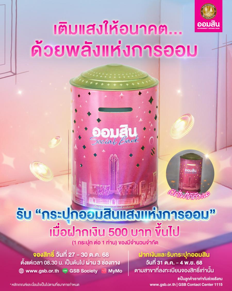 พร้อมกันนี้ ขอเชิญชวนร่วมเปิดมุมมองใหม่ของการออมในยุคดิจิทัล ในงาน “GSB SAVINGS FORUM 2025” ภายใต้แนวคิด “AI & AOM ออมยุคใหม่ สร้างสังคมไทยให้ยั่งยืน” วันที่ 31 ตุลาคม 2568 ณ ห้องแกรนด์บอลรูม ชั้น 6 อาคารออมสินพิพัฒน์ ธนาคารออมสินสำนักงานใหญ่ พบกิจกรรมสร้างแรงบันดาลใจในการใช้เทคโนโลยี AI กับ การออมมากมาย อาทิ เวทีมินิทอล์ก “ออมยุคใหม่ สร้างสังคมไทยให้ยั่งยืน” จากกูรูชื่อดัง การประกวดออกแบบ “กระปุกออมสินแห่งโลกยุคดิจิทัล” ด้วย AI รอบชิงชนะเลิศ และการเปิดตัว “โค้ชการเงินมืออาชีพ” หรือ CMC by GSB รุ่นแรก รวมถึงสิทธิพิเศษสำหรับผู้ลงทะเบียนล่วงหน้าจะได้รับกระปุกออมสิน “แสงแห่งการออม” (จำนวนจำกัด) ลงทะเบียนร่วมงานได้ที่ https://www.zipeventapp.com/e/GSB-Savings-Forum-2025 หรือรับชมสดผ่านเพจเฟซบุ๊ก GSB Society