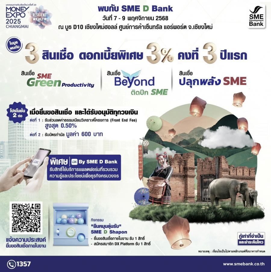 ธนาคารพัฒนาวิสาหกิจขนาดกลางและขนาดย่อมแห่งประเทศไทย (ธพว.) หรือ SME D Bank เข้าร่วมงานมหกรรมการเงินเชียงใหม่ ครั้งที่ 20 (MONEY EXPO 2025 CHIANGMAI) ระหว่างวันที่ 7-9 พฤศจิกายน 2568 ณ บูธ D10 เชียงใหม่ฮอลล์ เซ็นทรัลแอร์พอร์ต เชียงใหม่ จังหวัดเชียงใหม่ ยกทัพบริการ “พัฒนาคู่เติมทุน” สนับสนุนให้ผู้ประกอบการเอสเอ็มอี คว้าโอกาสธุรกิจเติบโตและต่อยอดจากนโยบาย Quick Big Win ของรัฐบาล ที่มุ่ง “กระตุ้นสั้น ได้ยาว กระจายตัว” เช่น โครงการคนละครึ่งพลัส และมาตรการกระตุ้นการท่องเที่ยว เป็นต้น