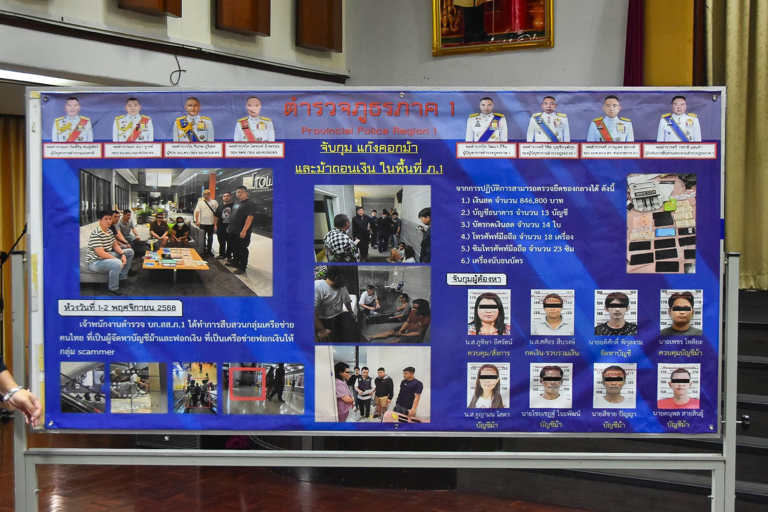 ระหว่างวันที่ 1 – 2 พฤศจิกายน 2568 ตำรวจภูธรภาค 1 โดย พล.ต.ท.วัฒนา ยี่จีน ผบช.ภ.1 พล.ต.ต.ภาณุเดช สุขวงศ์ รอง ผบช.สง.ก.ตร.ปฏิบัติราชการ ภ.1 พล.ต.ต.วิชิต บุญชินวุฒิกุล รอง ผบช.ภ.1 พล.ต.ต.วรชาติ แสนคำ ผบก.สส.ภ.1 พ.ต.อ.พีรศักดิ์ รอดบน รอง ผบก.สส.ภ.1 พ.ต.อ.มณเทียร เบ้าทอง รอง ผบก.ปฏิบัติราชการ บก.สส.ภ.1 พ.ต.อ.วิศิษฏ์ มะอักษร รอง ผบก.สส.ภ.1 พ.ต.อ.วิทิต จันทร์เอี่ยม รอง ผบก.สส.ภ.1 พ.ต.อ.ชินโชติ วัฒนธนานพ ผกก.สส.3 บก.สส.ภ.1นำการปฏิบัติการโดย พ.ต.อ.ประธาน นันทกอบกุล รอง ผบก.สส.ภ.1 พ.ต.อ.นัฎฐพงษ์ ศรีเพ็ญประภา ผกก.สส.2 บก.สส.ภ.1 พ.ต.อ.นภธร วาชัยยุง ผกก.วิเคราะห์ข่าวและเครื่องมือพิเศษ บก.สส.ภ.1 พ.ต.อ.พูนสุข เตชะประเสริฐพร ผกก.สส.1 บก.สส.ภ.1 พร้อมกำลังข้าราชการตำรวจ กก.สส.1 กก.สส.2 กก.สส.3 และ กก.วิเคราะห์ข่าวและเครื่องมือพิเศษ บก.สส.ภ.1ได้ทำการสืบสวนกลุ่มเครือข่ายคนไทยที่เป็นผู้จัดหาบัญชีม้าและฟอกเงิน ที่เป็นเครือข่ายฟอกเงินให้กลุ่ม scammer โดยได้ทำการสืบสวนจนทราบว่ามีกลุ่มบุคคลมีพฤติกรรมรวมตัวกันเป็นกลุ่ม จัดหาบัญชีม้าเพื่อ รับเงินจากกลุ่มแก๊งอาชญากรรมคอลเซ็นเตอร์ระหว่างประเทศ โดยมีหัวหน้าชาวจีนคอยสั่งการหญิงชาวไทยให้รวบรวมจัดหากลุ่มบุคคลที่จะรับโอนเงินจากการหลอกลวง นำเงินดังกล่าวมาฟอกด้วยวิธีการนำเงินสดไปและเปลี่ยนเป็นเงินสกุลคริปโตเคอเรนซี่ แล้วส่งต่อกลับคืนไปให้หัวหน้าชาวจีน โดยกลุ่มคอกม้าจะได้เงินเป็นเปอร์เซ็นของการกดเงิน
