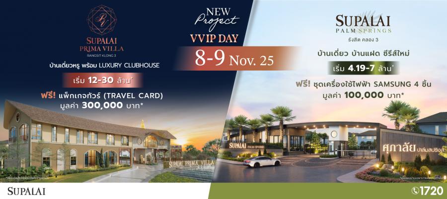 สัมผัสโอกาสพิเศษแห่งการใช้ชีวิตเหนือระดับก่อนใคร กับ 2 โครงการคุณภาพจากศุภาลัยพบกันในงาน “VVIP DAY” วันที่ 8–9 พฤศจิกายนนี้ พร้อมข้อเสนอสุดพิเศษเฉพาะภายในงาน เมื่อจองบ้านเดี่ยวหรูระดับพรีเมียม ศุภาลัย พรีมา วิลล่า รังสิต คลอง 3 ราคาเริ่มต้น 12-30 ล้านบาท* รับทันที ฟรี! แพ็กเกจท่องเที่ยว(Travel Card) มูลค่า 300000 บาท* หรือเลือกจองบ้านเดี่ยว–บ้านแฝดซีรีส์ใหม่ ศุภาลัย ปาล์มสปริงส์ รังสิต คลอง 3 ราคาเริ่มต้น 4-7 ล้านบาท* พร้อมรับ ฟรี! ชุดเครื่องใช้ไฟฟ้า SAMSUNG 4 ชิ้น มูลค่า 100000 บาท* สามารถเยี่ยมชมบ้านตัวอย่างได้แล้ววันนี้ (เงื่อนไขเป็นไปตามที่บริษัทฯ กำหนด)