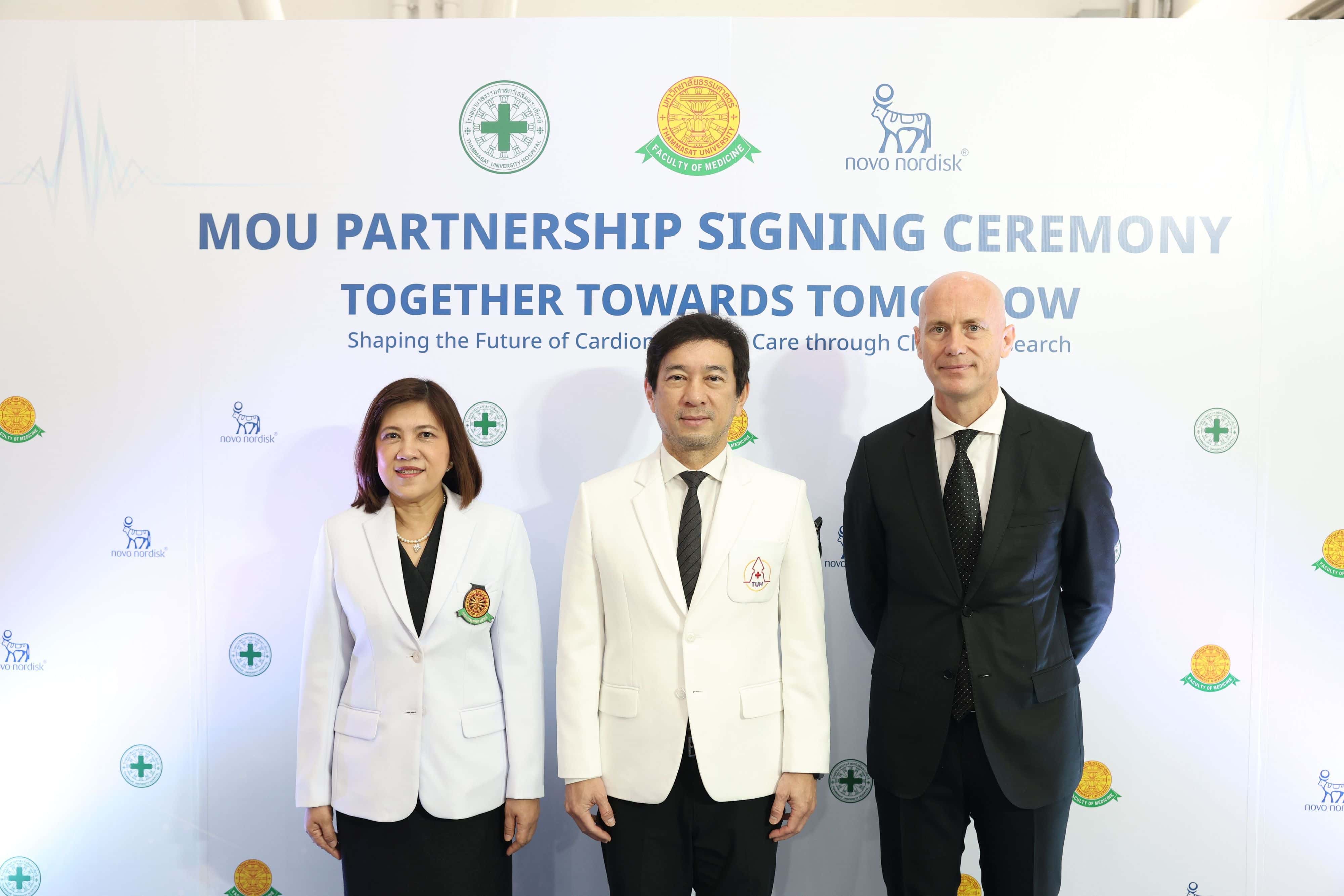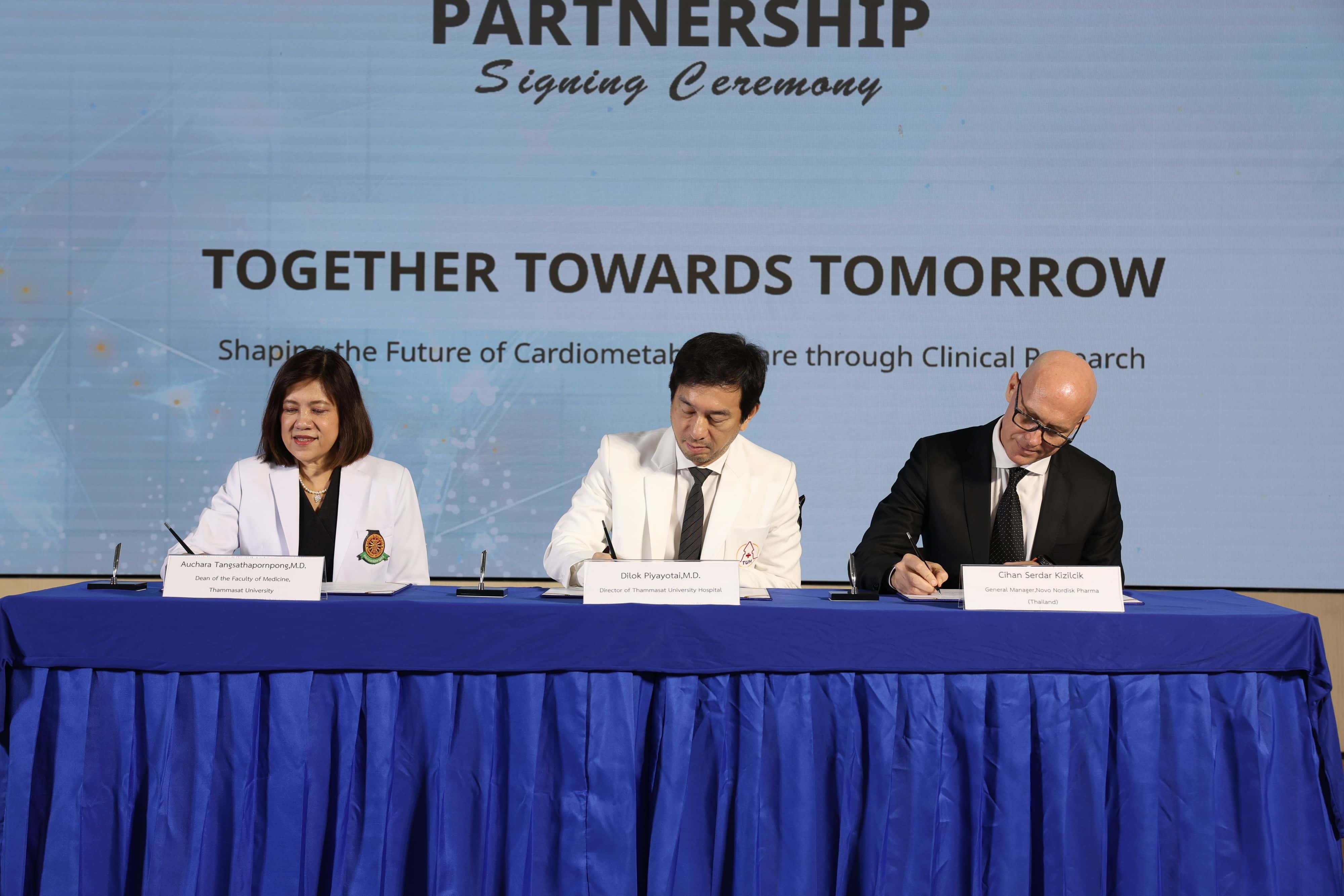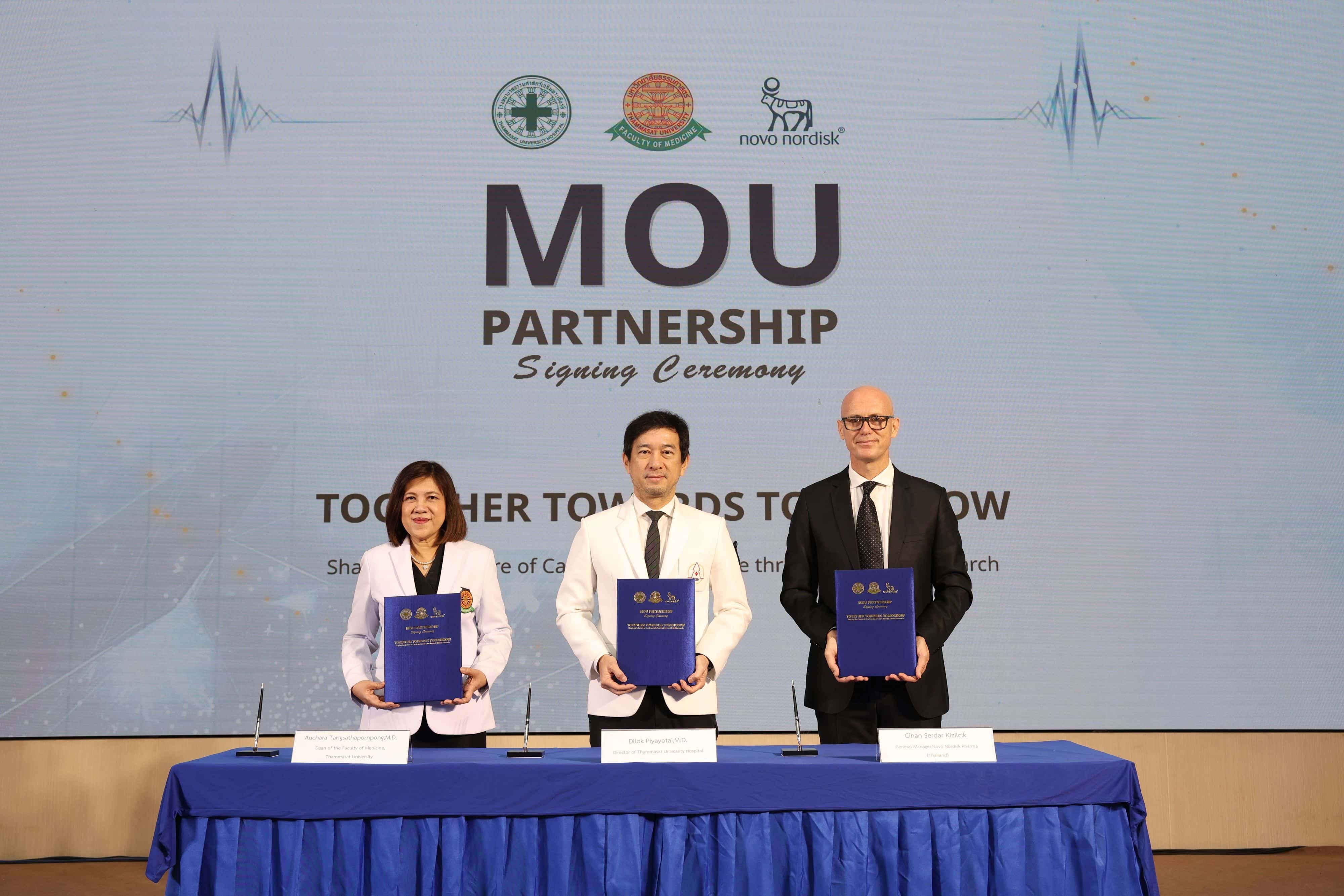 โรงพยาบาลธรรมศาสตร์เฉลิมพระเกียรติ คณะแพทยศาสตร์ มหาวิทยาลัยธรรมศาสตร์ และ บริษัท โนโว นอร์ดิสค์ ฟาร์มา (ประเทศไทย) จำกัด (“โนโว นอร์ดิสค์”) ได้ลงนามในบันทึกความเข้าใจ (MOU) เพื่อขยายขอบเขตงานวิจัยทางคลินิกภายในโรงพยาบาล โดยต่อยอดจากความสำเร็จของความร่วมมือเดิมที่พัฒนาการดูแลโรคอ้วนและโรคเบาหวานอย่างครบวงจรของโรงพยาบาลฯ บันทึกความตกลงฉบับนี้มีเป้าหมายหลักในการขับเคลื่อนการเปลี่ยนแปลงเชิงบวกในการบริหารจัดการและการรักษาโรคหัวใจ หลอดเลือด และโรคทางเมแทบอลิก ในประเทศไทย