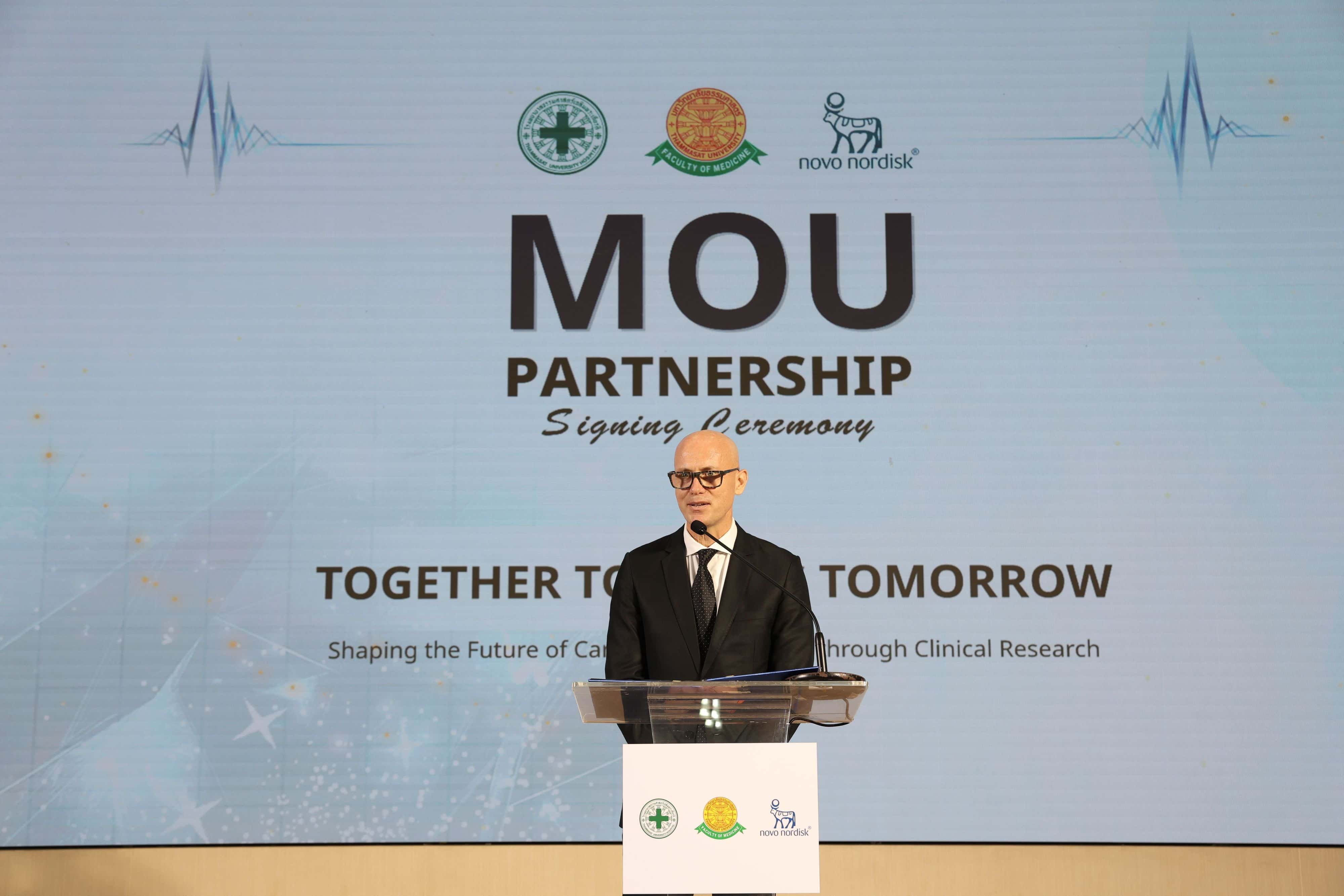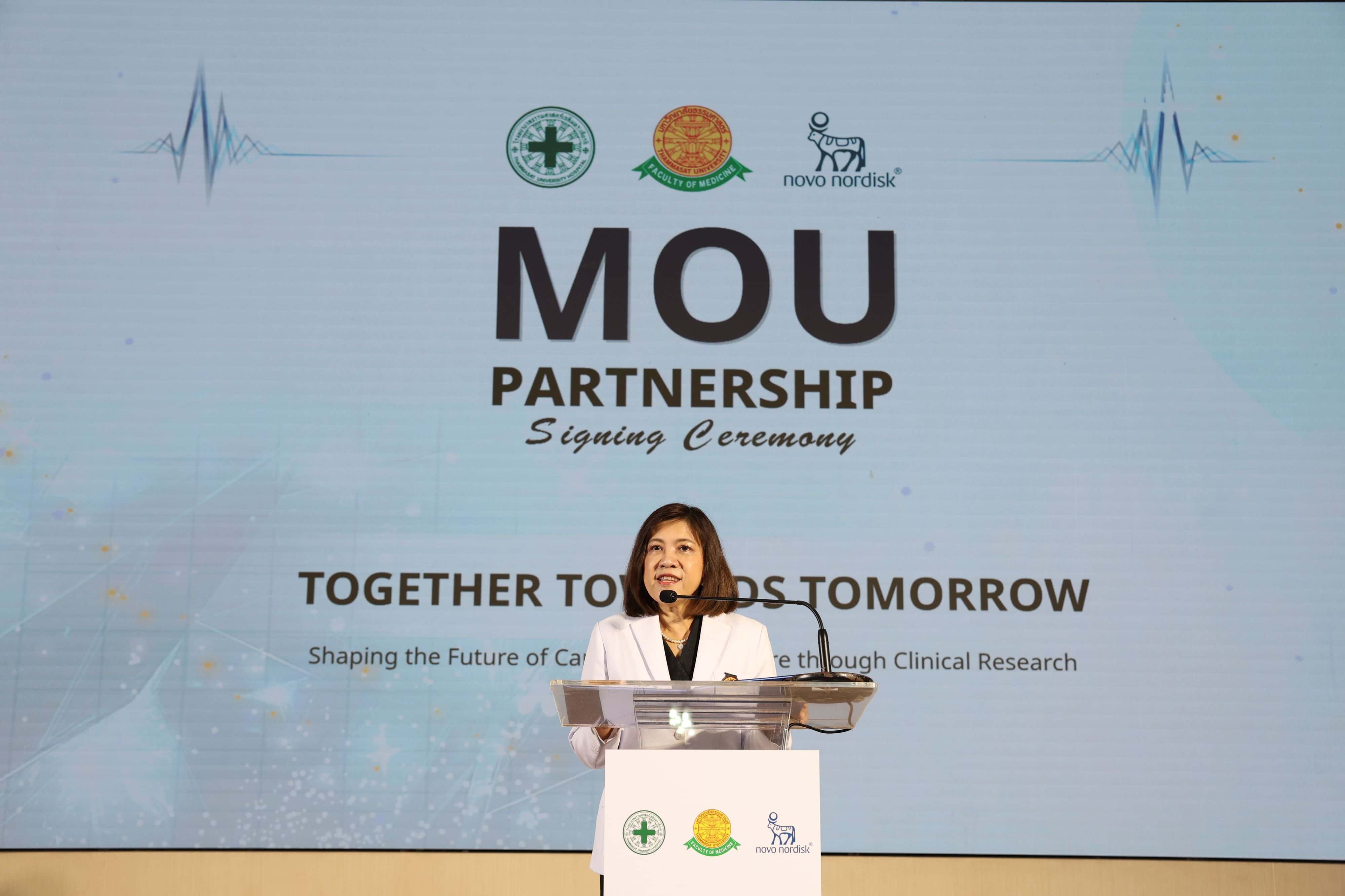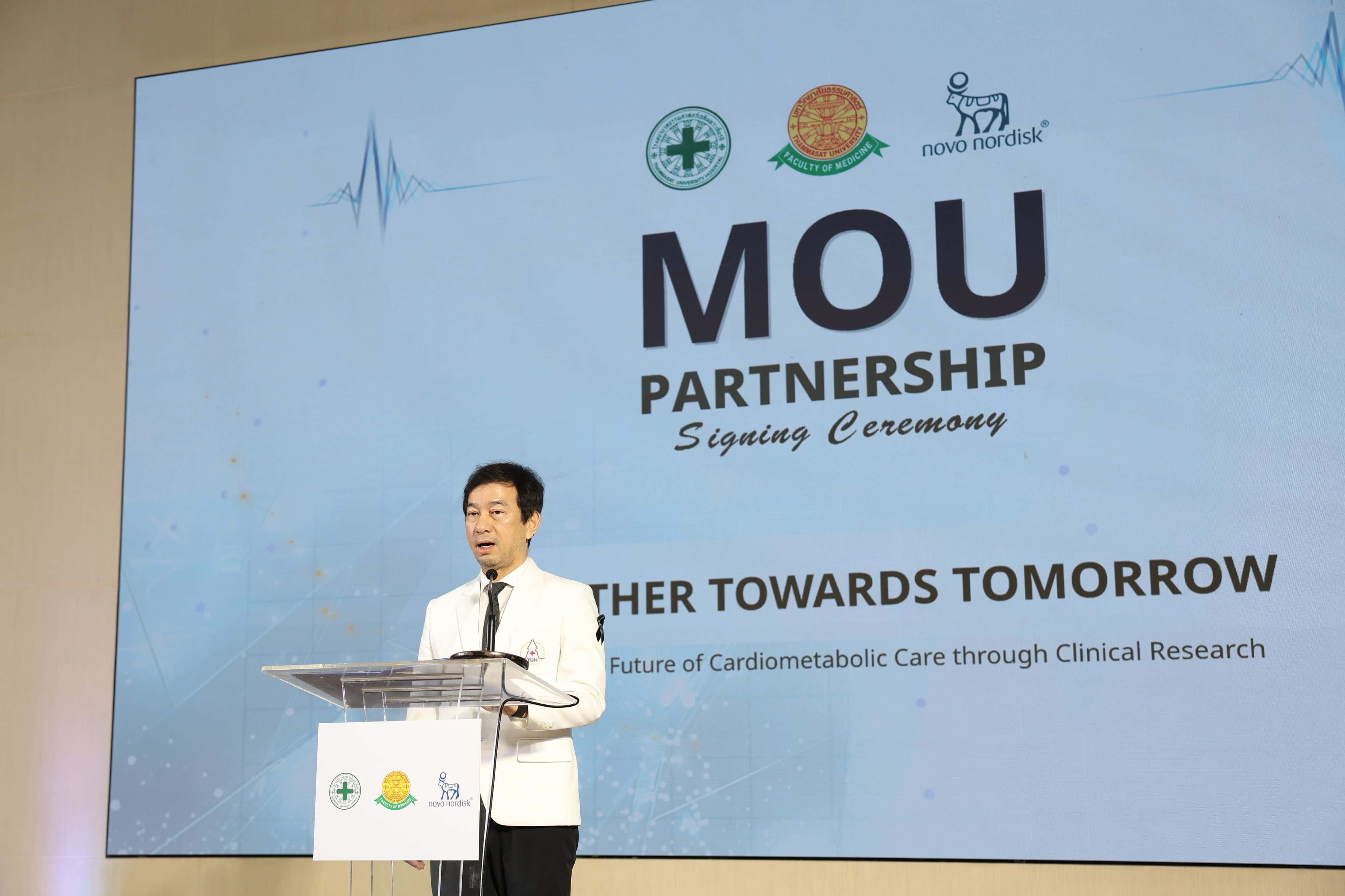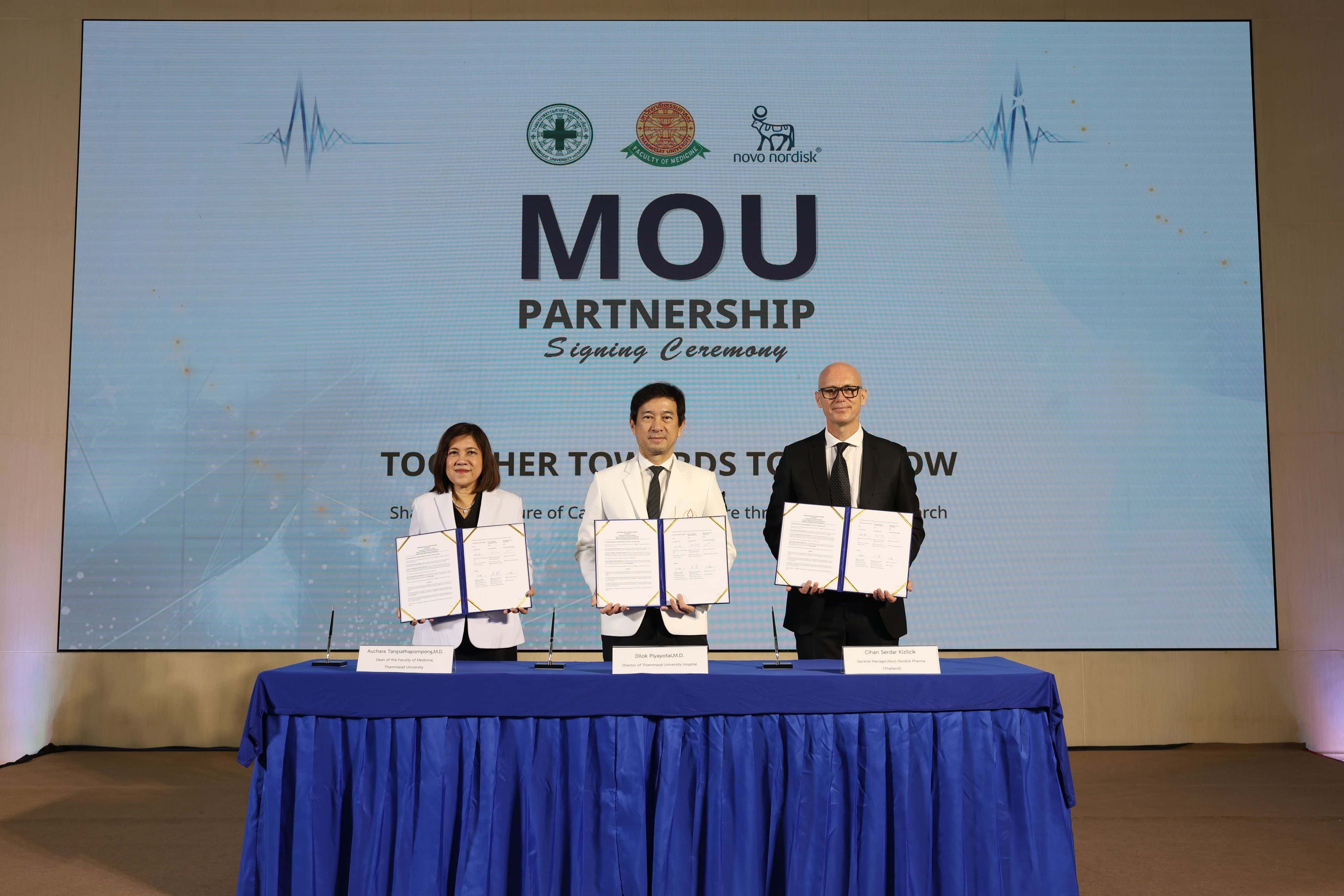 โรงพยาบาลธรรมศาสตร์เฉลิมพระเกียรติ คณะแพทยศาสตร์ มหาวิทยาลัยธรรมศาสตร์ และ บริษัท โนโว นอร์ดิสค์ ฟาร์มา (ประเทศไทย) จำกัด (“โนโว นอร์ดิสค์”) ได้ลงนามในบันทึกความเข้าใจ (MOU) เพื่อขยายขอบเขตงานวิจัยทางคลินิกภายในโรงพยาบาล โดยต่อยอดจากความสำเร็จของความร่วมมือเดิมที่พัฒนาการดูแลโรคอ้วนและโรคเบาหวานอย่างครบวงจรของโรงพยาบาลฯ บันทึกความตกลงฉบับนี้มีเป้าหมายหลักในการขับเคลื่อนการเปลี่ยนแปลงเชิงบวกในการบริหารจัดการและการรักษาโรคหัวใจ หลอดเลือด และโรคทางเมแทบอลิก ในประเทศไทย