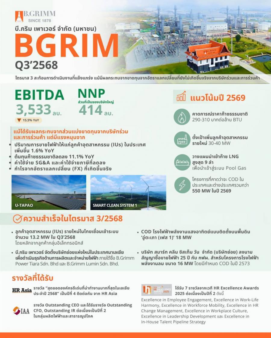 ความเคลื่อนไหวสำคัญในไตรมาสที่ 3 ที่ส่งผลต่อการเติบโตของ บี.กริม เพาเวอร์ ได้แก่ การเชื่อมเข้าระบบของลูกค้าอุตสาหกรรมรายใหม่ในประเทศไทย จำนวน 13.2 เมกะวัตต์ ส่วนใหญ่มาจากกลุ่มอิเล็กทรอนิกส์ ทำให้ยอดรวมเป็น 33.9 เมกะวัตต์ ในงวด 9 เดือน เป็นไปตามแผนเป้าหมายปี 2568 ที่ตั้งไว้ที่ 40–50 เมกะวัตต์ นอกจากนี้ ในเดือนกรกฎาคม บี.กริม เพาเวอร์ ได้ประกาศจัดตั้ง บริษัทย่อยแห่งใหม่ 2 แห่งในประเทศมาเลเซีย เพื่อดำเนินธุรกิจด้านการผลิตและจำหน่ายไฟฟ้า และในเดือนกันยายน โครงการโรงไฟฟ้าพลังงานแสงอาทิตย์แบบติดตั้งบนพื้นดิน อู่ตะเภา (เฟส 1) กำลังการผลิตติดตั้งรวม 18 เมกะวัตต์ เริ่มดำเนินการเชิงพาณิชย์ (COD) เรียบร้อยแล้ว โดยมีสัญญาซื้อขายไฟฟ้า 25 ปี กับ กิจการไฟฟ้าสัตหีบ หน่วยสวัสดิการกองทัพเรือ กำลังผลิตตามสัญญา 15 เมกะวัตต์ และล่าสุดในเดือนตุลาคม บริษัท สมาร์ท คลีน ซิสเท็ม วัน จำกัด ซึ่งเป็นบริษัทย่อยของ บี.กริม เพาเวอร์ ได้ลงนามในสัญญาซื้อขายไฟฟ้า 25 ปี กับการไฟฟ้าฝ่ายผลิตแห่งประเทศไทย (กฟผ.) สำหรับโครงการโรงไฟฟ้าพลังงานลม กำลังการผลิตตามสัญญา 16 เมกะวัตต์ โดยกำหนด COD ในปี 2573