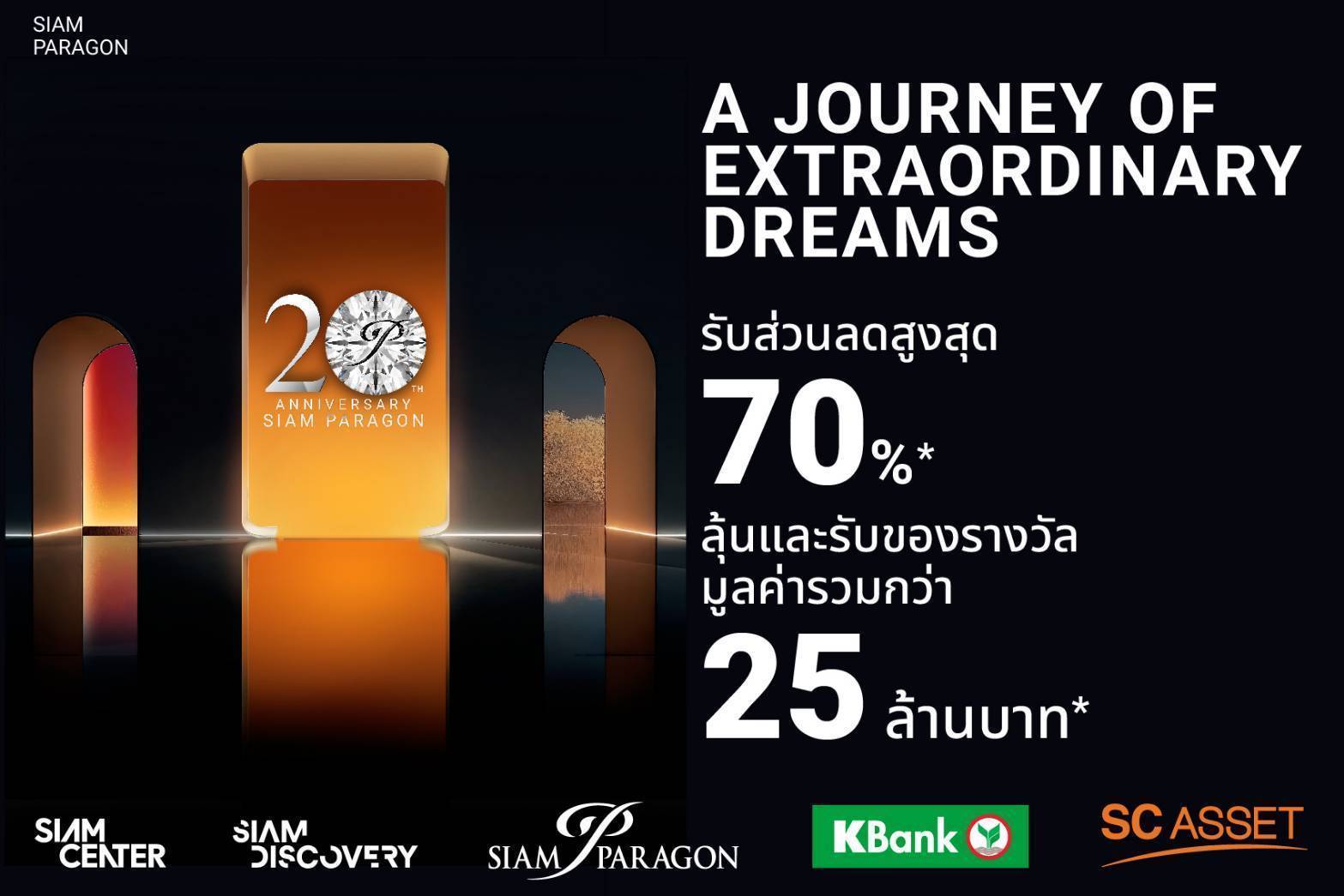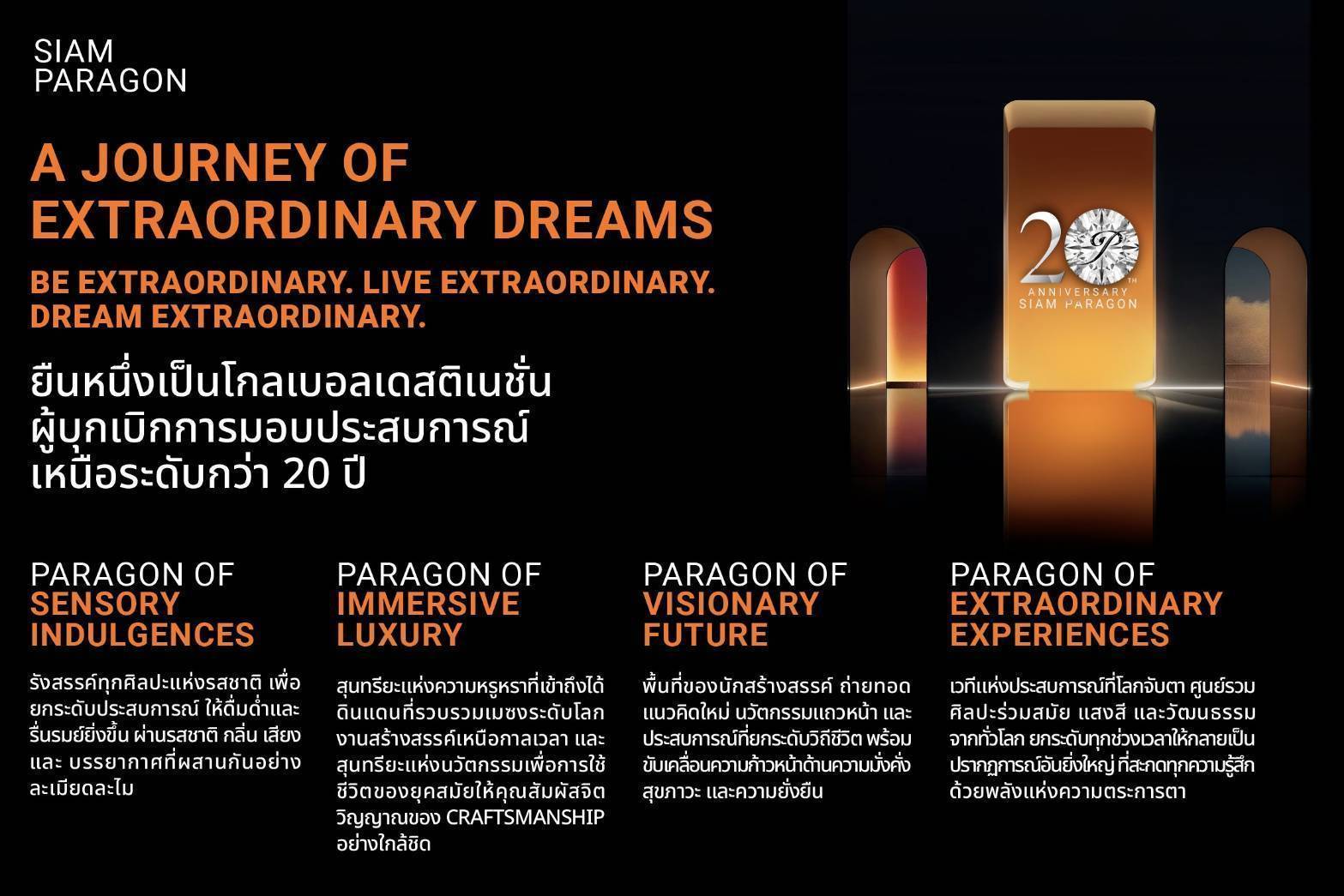 สยามพารากอน แลนด์มาร์คระดับโลกที่ตอบโจทย์การใช้ชีวิตแห่งโลกอนาคตในทุกมิติ มุ่งมั่นสร้างปรากฏการณ์แปลกใหม่ตื่นตาตื่นใจให้โลกศูนย์การค้า พร้อมมอบประสบการณ์เหนือความคาดหมาย ฉลองครบรอบ 20 ปี ที่ครองใจนักช้อปชาวไทยและนักท่องเที่ยวจากทั่วโลก ผนึกกำลัง ศูนย์ฯและห้างฯ พร้อมพันธมิตร สร้างปรากฏการณ์ Be Extraordinary Live Extraordinary Dream Extraordinary มอบประสบการณ์เหนือระดับทุกพื้นที่ อัดแน่นแคมเปญสุดพิเศษ ลุ้นรับรางวัลใหญ่บ้านพักตากอากาศจาก SC ASSET พร้อมสิทธิประโยชน์จากพันธมิตรและบัตรเครดิตชั้นนำ รวมมูลค่ากว่า 25 ล้านบาท ผลักดันและส่งเสริมตลาดการท่องเที่ยวไทย