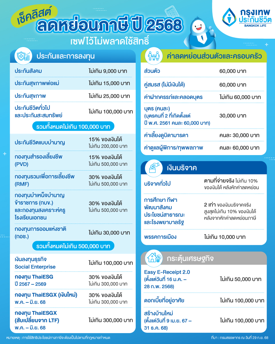 • โครงการ Easy E-Receipt 2.0 (ตั้งแต่วันที่ 16 มกราคม – 28 กุมภาพันธ์ 2568) ลดหย่อนภาษีได้สูงสุด 50000 บาท จากการซื้อสินค้าหรือค่าบริการ ที่มี e-Tax Invoice หรือ e-Receipt