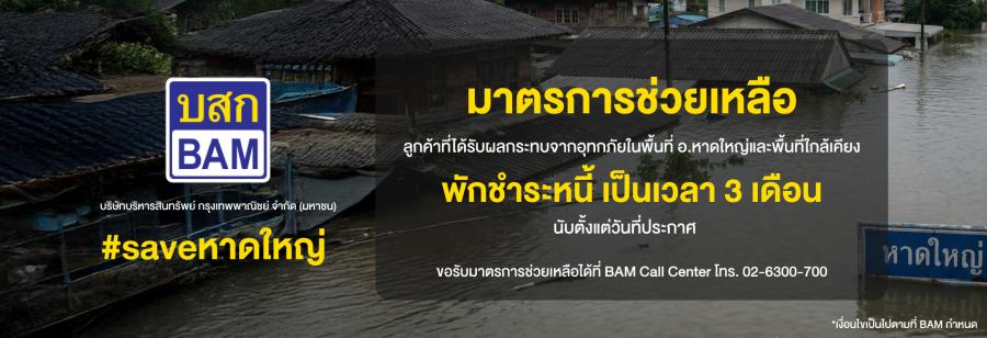 BAM ห่วงใยลูกค้า พนักงาน และชุมชนที่ได้รับผลกระทบจากเหตุการณ์น้ำท่วมในเขตอำเภอหาดใหญ่ และพื้นที่ภาคใต้ พร้อมเร่งตรวจสอบปัญหาต่าง ๆ ของลูกค้าและพนักงาน และเตรียมพิจารณาให้ความช่วยเหลืออย่างเร่งด่วนด้วยมาตรการพักชำระหนี้ 3 เดือน ขึ้นอยู่กับผลกระทบมากน้อย โดยพิจารณาเป็นรายๆ ไป เพื่อบรรเทาความเดือดร้อนทันที