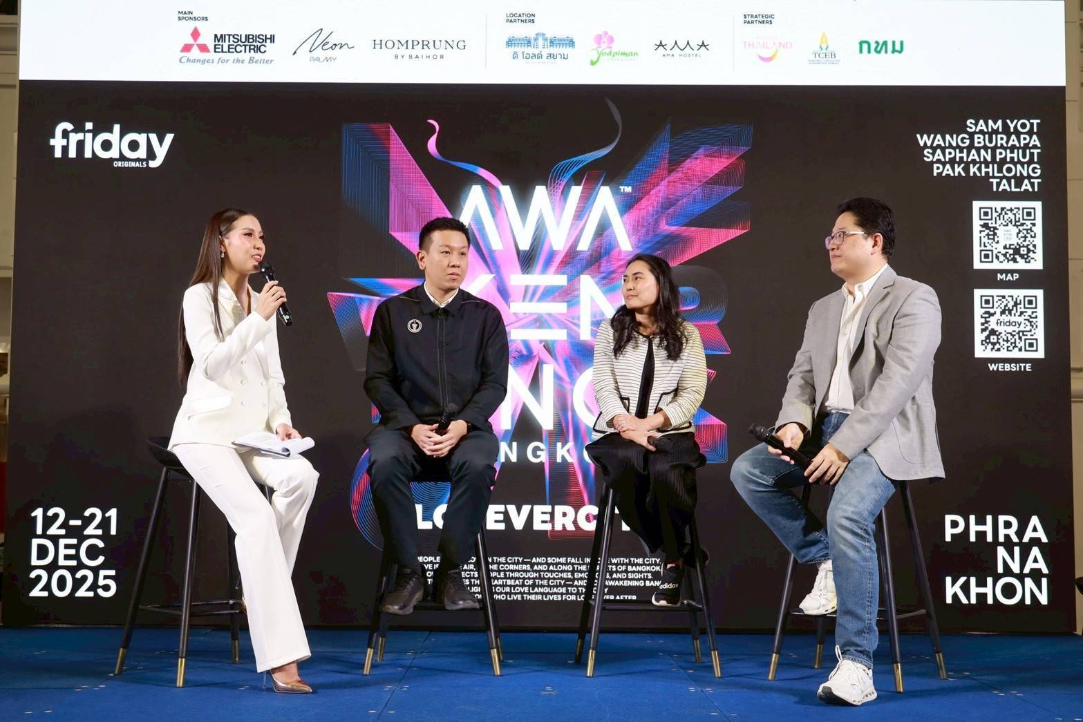 “Awakening Bangkok 2025” จัดโดย “Friday” แบรนด์ไลฟ์สไตล์ที่มุ่งสร้างสีสันความสนุกและพลังงานใหม่ ๆ ให้กับกรุงเทพฯ ด้วยการสนับสนุนจาก Mitsubishi Electric SangSom และ หอมปรุงบายใบห่อ ร่วมด้วย การท่องเที่ยวแห่งประเทศไทย สำนักงานส่งเสริมการจัดประชุมและนิทรรศการ (องค์การมหาชน) กรุงเทพมหานคร ดิ โอลด์ สยาม พลาซ่า ยอดพิมานริเวอร์วอล์ค ตลาดยอดพิมาน และ AMA Hostel โดยนับเป็นเทศกาลเทศกาลแสงไฟและศิลปะดิจิทัลครั้งที่สองของปีที่จัดขึ้นในกรุงเทพฯ สานต่อความสำเร็จของ Awakening Song Wat 2025 ที่จัดขึ้นเมื่อช่วงกลางปีที่ผ่านมา ภายใต้ความตั้งใจที่จะมุ่งเน้นบทบาทของเทศกาลแสงสีในการกระตุ้นเศรษฐกิจกลางคืน (Night-time Economy) ให้เติบโตอย่างสร้างสรรค์ และดึงดูดผู้คน เพื่อปลุกย่านเมืองเก่าให้กลับมามีชีวิตชีวายิ่งกว่าเดิม