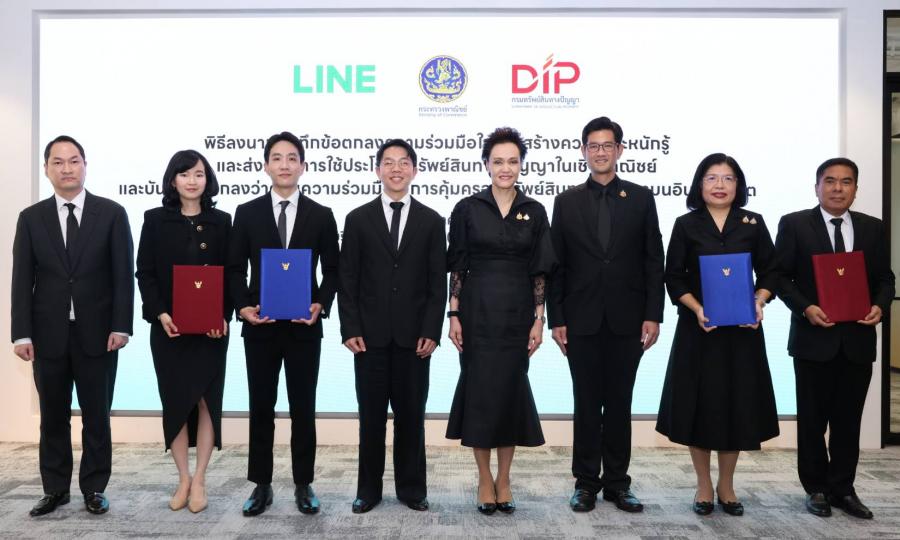 LINE ประเทศไทย และกรมทรัพย์สินทางปัญญา กระทรวงพาณิชย์ ร่วมลงนามบันทึกข้อตกลงความร่วมมือ (MOU) เพื่อสร้างความตระหนักรู้ด้านทรัพย์สินทางปัญญา และส่งเสริมการนำทรัพย์สินทางปัญญาไปใช้ประโยชน์ในเชิงพาณิชย์อย่างมีประสิทธิภาพ โดยมี นางศุภจี สุธรรมพันธุ์ รัฐมนตรีว่าการกระทรวงพาณิชย์ ให้เกียรติเข้าร่วมเป็นสักขีพยาน ณ บริษัท ไลน์ คอมพานี (ประเทศไทย) จำกัด