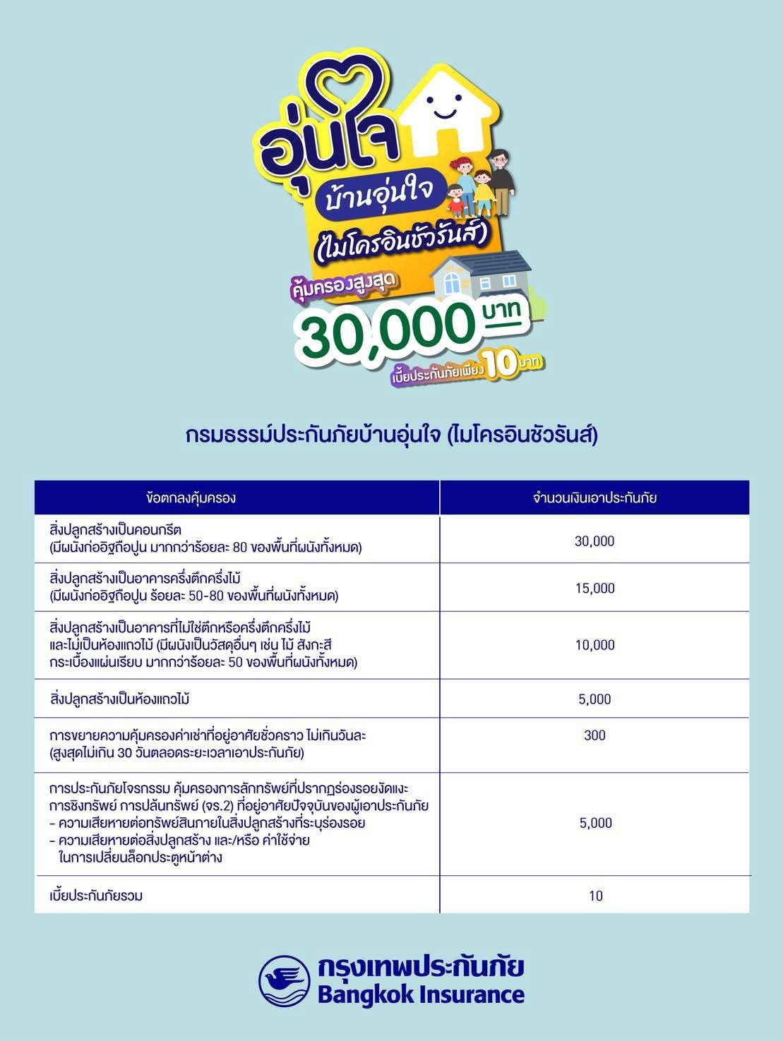• กรมธรรม์ประกันภัยบ้านอุ่นใจ (ไมโครอินชัวรันส์) เบี้ยประกันภัย 10 บาท โดยให้ความคุ้มครอง - ความเสียหายจากเหตุไฟไหม้ ฟ้าผ่า ระเบิด สูงสุด 30,000 บาท - ความเสียหายจากลมพายุ น้ำท่วม แผ่นดินไหว - การโจรกรรมที่ปรากฏร่องรอยงัดแงะ - ค่าเช่าที่พักอาศัยชั่วคราว วันละ 300 บาท (สูงสุด 30 วัน) - ระยะเวลาเอาประกันภัย 30 วัน