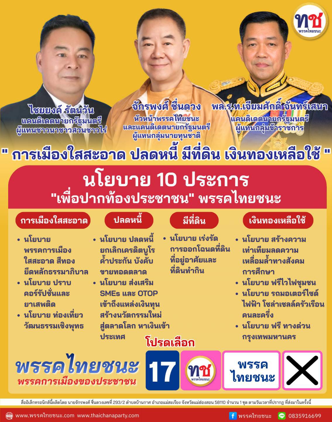 ในครั้งนี้ พรรคไทยชนะมีความมั่นใจว่าด้วยอุดมการณ์และเจตนารมณ์ของพรรคคือ ยึดมั่นในหลักธรรมาภิบาล จะทำให้พรรคไทยชนะได้รับการตอบรับจากเสียงของพี่น้องประชาชนที่ยังไม่ตัดสินใจเลือกพรรคใดให้หันมาเลือกพรรคไทยชนะ และทำให้พรรคไทยชนะเข้าสู่การร่วมรัฐบาล เพื่อผลักดันนโยบายเรื่องปากท้องพี่น้องประชาชน และแก้ไขปัญหาหนี้สิน ยกเลิกเครดิตบูโร สร้างการเมืองใสสะอาด ปลดหนี้ มีที่ดิน เงินทองเหลือใช้ ช่วยเหลือกลุ่ม SMEs ให้เขาถึงแหล่งเงินทุน ลดความเหลื่อมล้ำทางสังคมด้านการศึกษา ฟรี WiFi ชุมชนทุกชุมชน นโยบายรถมอเตอร์ไซค์ไฟฟ้าและโซล่าเซลล์ครัวเรือนคนละครึ่ง นโยบายขึ้นทางด่วนกรุงเทพฯฟรีเพื่อลดปัญหาการจราจร ซึ่งเป็นปัญหาใหญ่ของคนกรุงเทพฯ ทำให้ เพิ่มมูลค่าทางด้านเศรษฐกิจของกรุงเทพมหานครอีกมหาศาล “หากได้ยินคำว่า 17 (สิบเจ็ด)ให้เลือกเบอร์ 17” แล้วจะโชคดีครับ นายจักรพงศ์ ชื่นดวง หัวหน้าพรรคไทยชนะกล่าว.