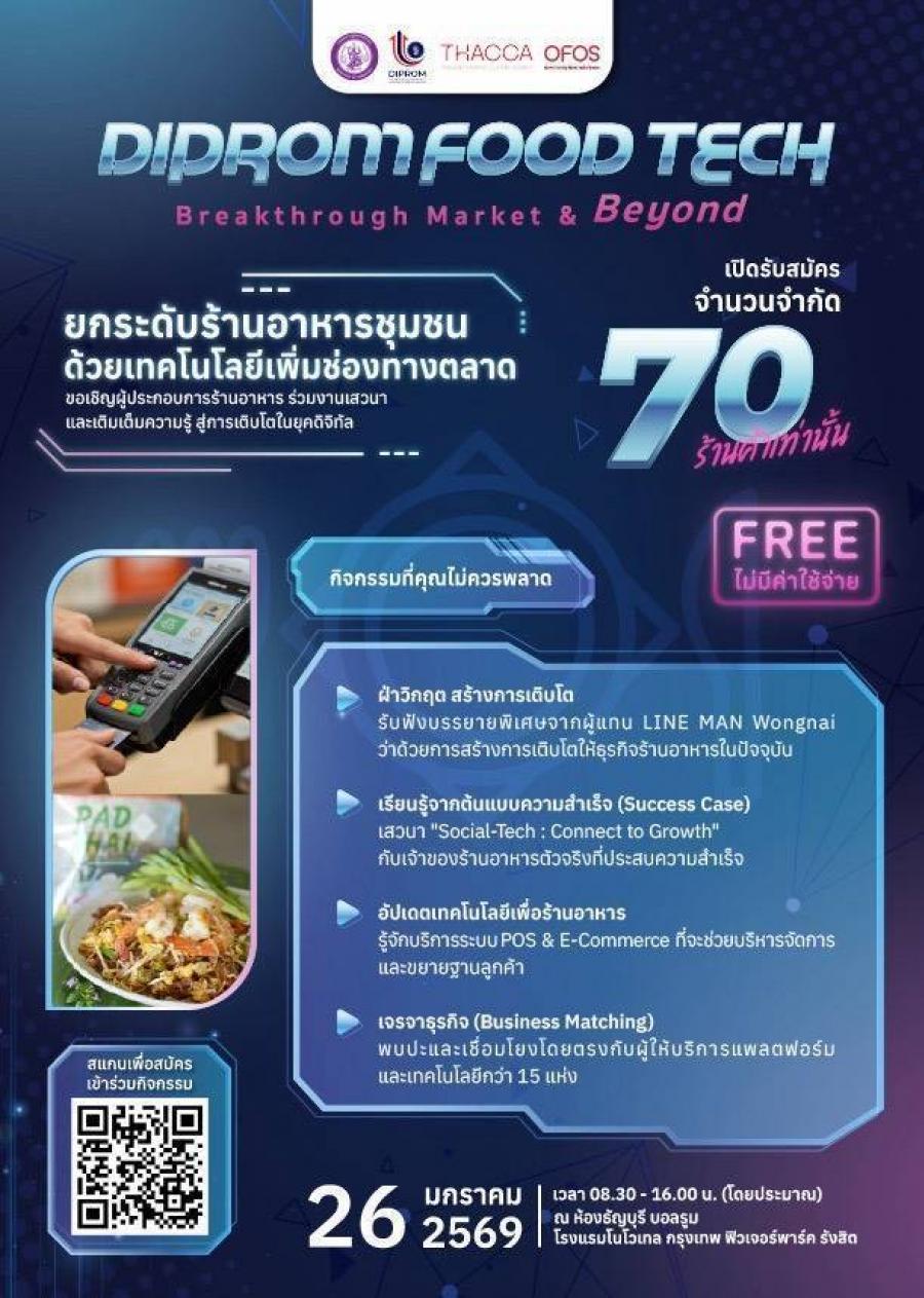 กรมส่งเสริมอุตสาหกรรม เชิญชวนธุรกิจร้านอาหาร ร่วมงาน DIPROM FOOD TECH วันจันทร์ที่ 26 มกราคมนี้ ด่วน รับจำนวนจำกัด เพื่อฝ่าวิกฤต สร้างการเติบโตในยุคดิจิทัล