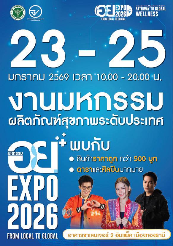 ขอเชิญชวนประชาชนร่วมชม ชอป ผลิตภัณฑ์สุขภาพที่ผ่านการกำกับดูแลจาก อย. ในราคาที่เข้าถึงได้ ช่วยลดภาระค่าครองชีพ และร่วมเป็นส่วนหนึ่งในการสนับสนุนเศรษฐกิจสุขภาพของประเทศ ในงานมหกรรม อย. EXPO 2026 “From Local to Global” ณ อาคารชาเลนเจอร์ 2 อิมแพ็ค เมืองทองธานี ระหว่างวันที่ 23–25 มกราคม 2569 เวลา 10.00–20.00 น. โดยเข้าชมฟรีตลอดงาน
